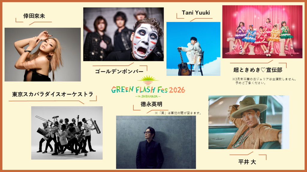 | その他 | ※坂井市内在住の方・坂井市内の学校に通う学生の方については、お得なチケットを枚数限定で別途発売しております。詳しくは公式ホームページのNEWSをご確認ください。 ※開場の「芝政ワールド」はイベントで貸切となり、施設のみをお楽しみいただく方の入場はできません。 ※イベントチケットをご購入の方は、芝政ワールド内のアトラクションも利用できます。 ※屋外公演・雨天決行です。強風・強雨などの荒天等により実施できないとの判断があった場合は中止となります。ご出発前に公式ホームページ等でご確認ください。 ※プールの営業はございません。 ※営利目的としたチケットの転売は、いかなる場合も固くお断りいたします。また、転売されたチケットは無効となり入場をお断りいたしますのでご注意ください。 ※客席を含む会場内の映像・写真が公開されることがあります。予めご了承ください。 公式ホームページ → GREEN FLASH FES ※学生協では、駐車場及びシャトルバスのチケットの販売はございません。事前にご確認のうえ、お申し込み、ご出発くださいますようお願い申し上げます。 |
