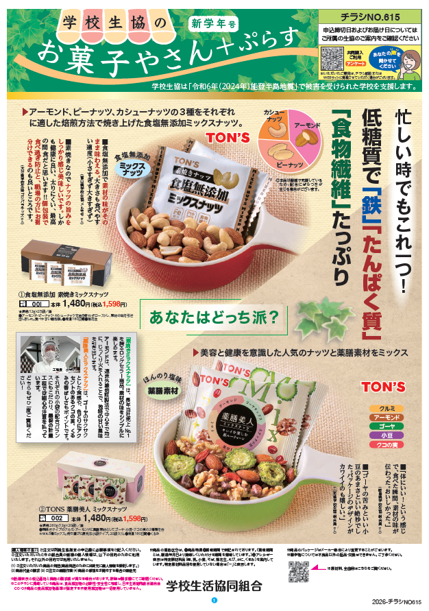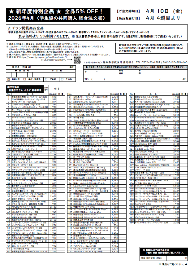 ご注文締切日:4月10日(金) 商品お届け日:4月4週目より チラシ掲載商品全品(学校生協のお菓子やさん ぷらす、学校生協の本やさん ぷらす、新学期ソックスセレクション、あったらいいな春、すまいる・らいふ)を表示価格より5%割引いたします。 ※注文書表示価格、割引前の金額です。(請求時に、割引価格にてご請求いたします。)