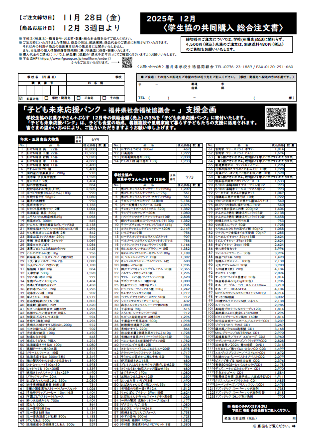 ご注文締切日:11月28日(金) 商品お届け日:12月3週目より ≪「子ども未来応援バンク ー福井県社会福祉協議会ー」支援企画≫ お菓子やさん ぷらす 12月号の供給金額(売上)の3%を「子ども未来応援バンク」に寄付いたします。 「子ども未来応援バンク」は、子ども食堂の助成、養護施設や里親家庭で暮らす子どもたちの支援に活用されます。 皆さまの温かいお心により、ご協力いただきますようお願い申し上げます。