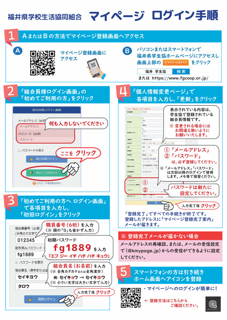A.学生協へ加入申込書を提出していただき、組合員登録完了後にログイン登録に必要な案内を送付いたしますので、内容を確認しご登録ください。